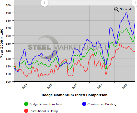 Below is a graph showing the history of the Dodge Momentum Index. You will need to view the graph on our website to use its interactive features; you can do so by clicking here. If you need assistance logging in to or navigating the website, please contact us at info@SteelMarketUpdate.com.