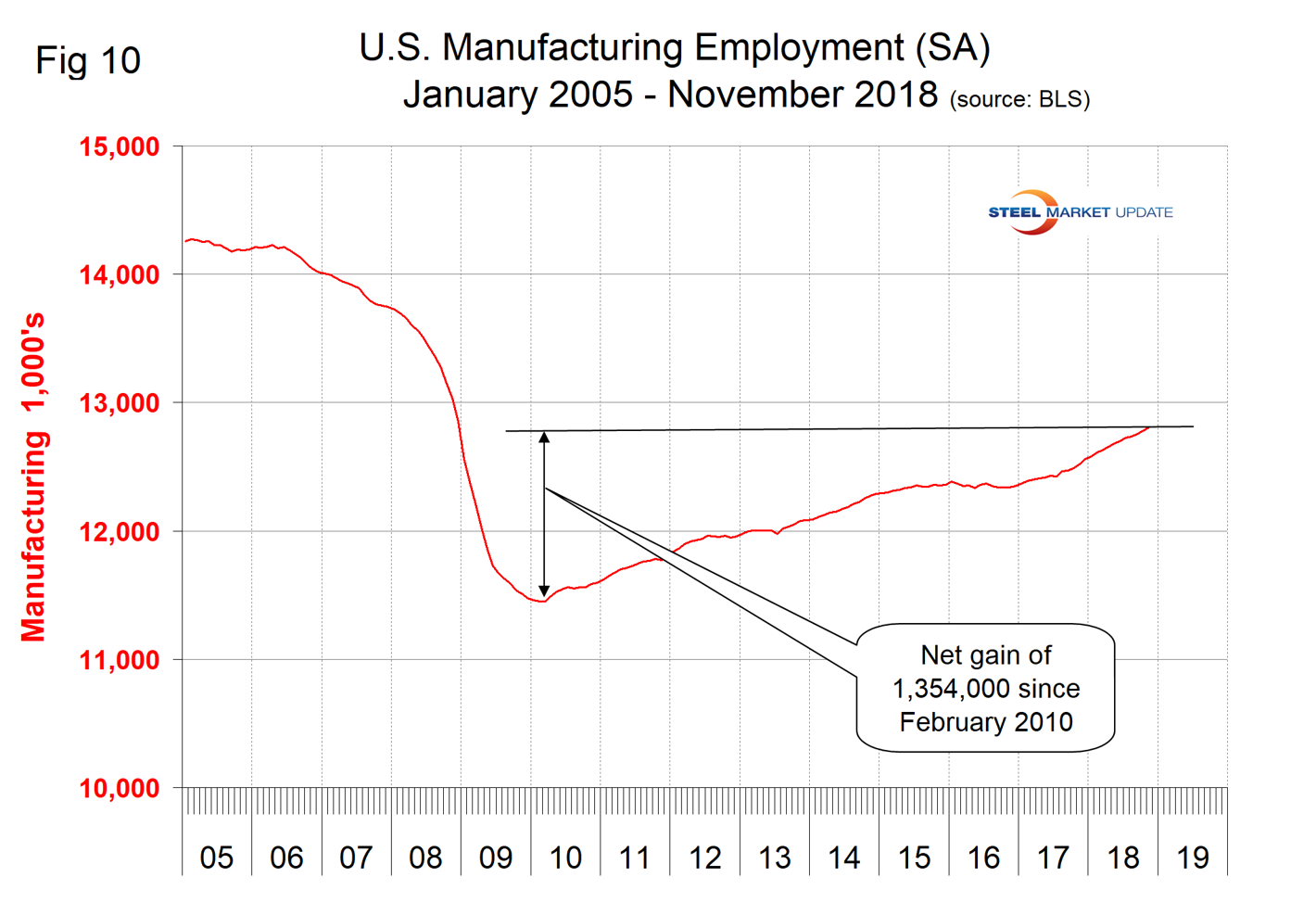 Manufacturing employment plummeted during the recession and gradually improved from the spring of 2010 through 2014. Growth was flat in 2015 and declined slightly in 2016 when 23,000 jobs were lost during the year as a whole. There was a turnaround in 2017, and in the 12 months from December 2017 through November 2018, 288,000 manufacturing jobs were created (Figure 10). The motor vehicles and parts subcomponent of manufacturing employment had a net gain of only 14,000 in the same timeframe.