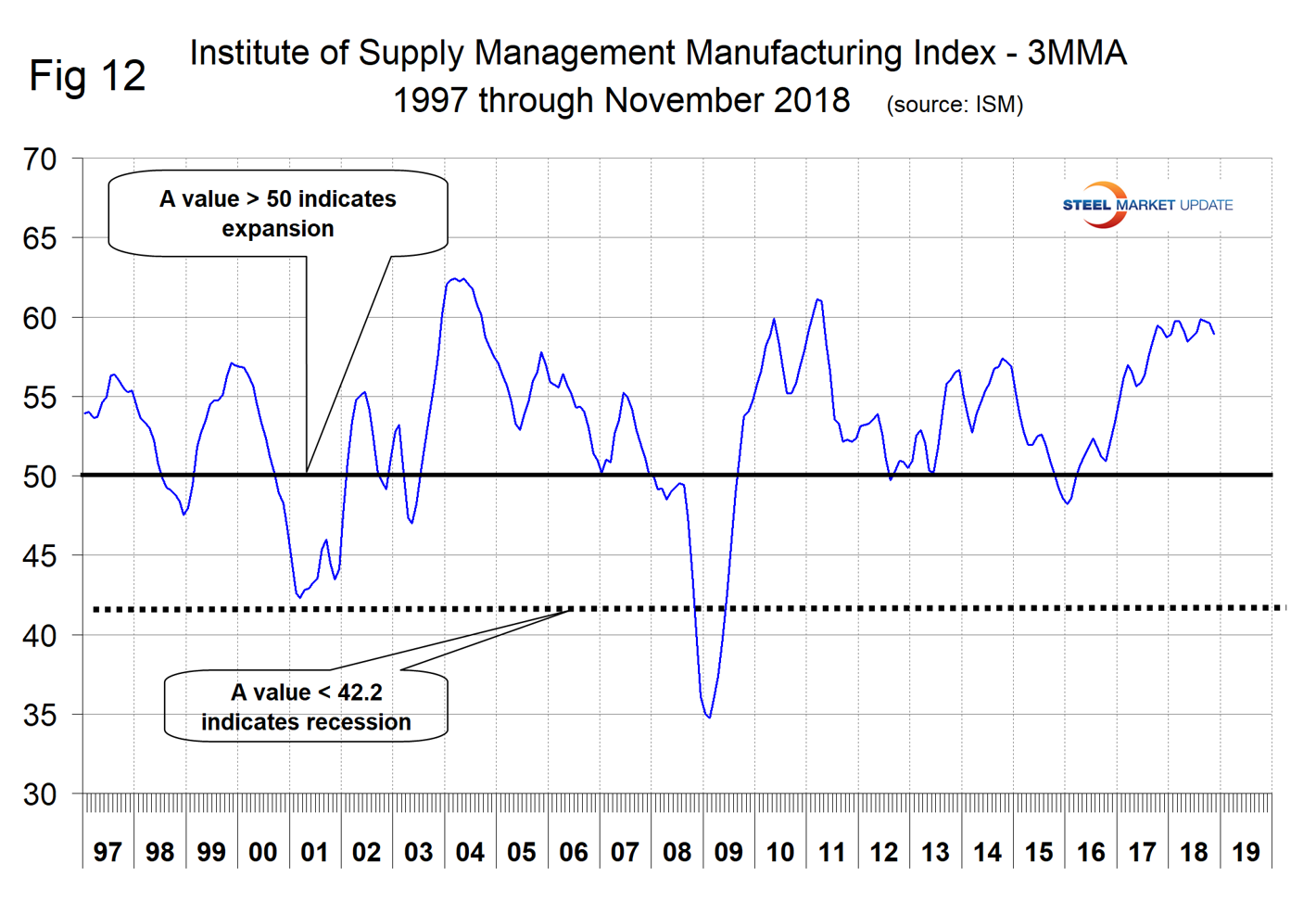 The Institute for Supply Management’s Manufacturing Index is a diffusion index. ISM states: “Diffusion indexes have the properties of leading indicators and are convenient summary measures showing the prevailing direction of change and the scope of change. An index value above 50 percent indicates that the manufacturing economy is generally expanding; below 50 percent indicates the opposite.” Figure 12 shows the 3MMA of the ISM index from January 1997 through November 2018. The index surged from January 2016 through October 2017, but has since leveled out. In November 2018, the 3MMA of the index was 58.93, down from 59.87 in August and down by 0.3 percent year over year. A value greater than 50 indicates expansion.