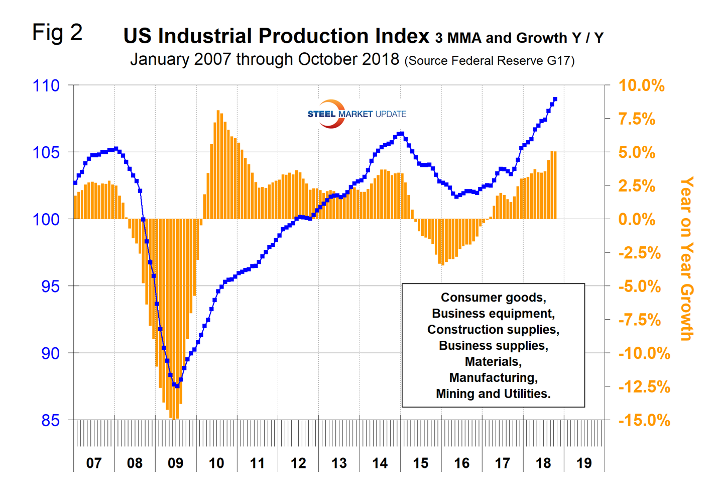 The U.S. Census Bureau announced last week that new orders for manufactured durable goods in October were unchanged from September on a 3MMA basis month over month and were up by 8.2 percent year over year. Figure 4 shows the 3MMA since January 2010 and that the year-over-year improvement in 2018 has been the highest since 2014.