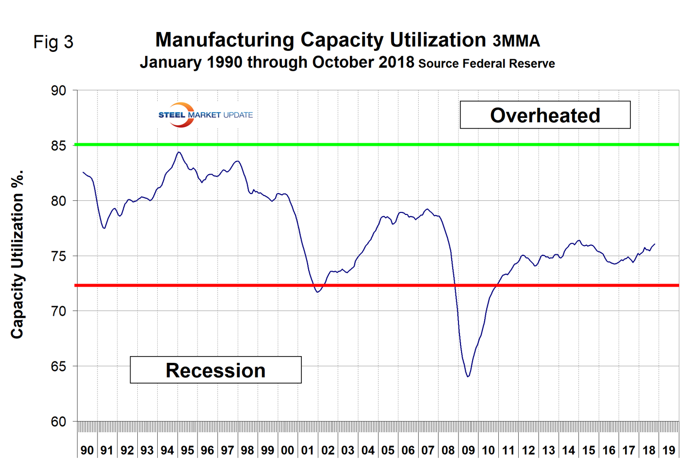 Figure 2 shows the three-month moving average (3MMA) of the IP index since January 2007 as the blue line and the year-over-year growth as the brown bars. March 2017 was the first month of positive growth in the 3MMA since April 2015. Growth has been above 3 percent every month since February, reaching 5.0 percent in October. Manufacturing capacity utilization improved from 74.48 percent in January last year to 76.06 percent in October 2018, also on a 3MMA basis (Figure 3). This was the first time to exceed 76 percent since February 2015.