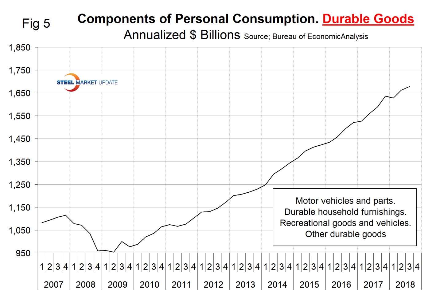 The second estimate of Q3 2018 GDP came in at 3.5 percent annualized growth, which was unchanged from the first estimate and up from 2.2 percent in Q1 2018. A subcomponent of the quarterly data is durable goods, which is part of the personal consumption calculation. It therefore contains no military hardware or civil aircraft data. This is shown in Figure 5 and, presumably because of the exclusions just mentioned, looks nothing like the blue line in Figure 4. The durable goods portion of GDP declined in Q1 2018, but the long-term trend is still very positive.