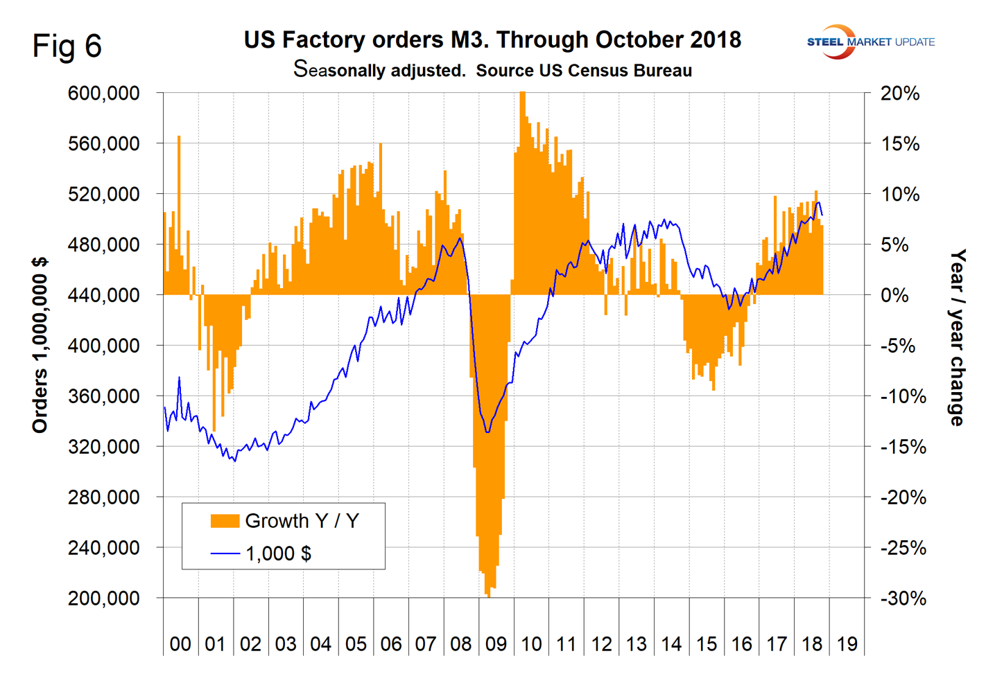 New orders for manufactured products as reported by the Census Bureau have been steadily increasing since mid-2016. In October, year-over-year growth was 6.9 percent, down from 10.3 percent in August (Figure 6).