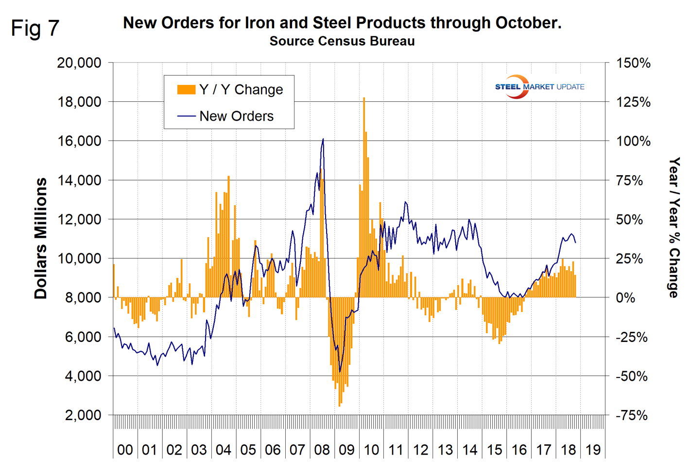 Within the Census Bureau M3 manufacturing survey is a subsection for new orders of iron and steel products. Figure 7 shows the history since January 2000 and that orders declined in September and October. The growth rate year over year is still good at 14.4 percent.
