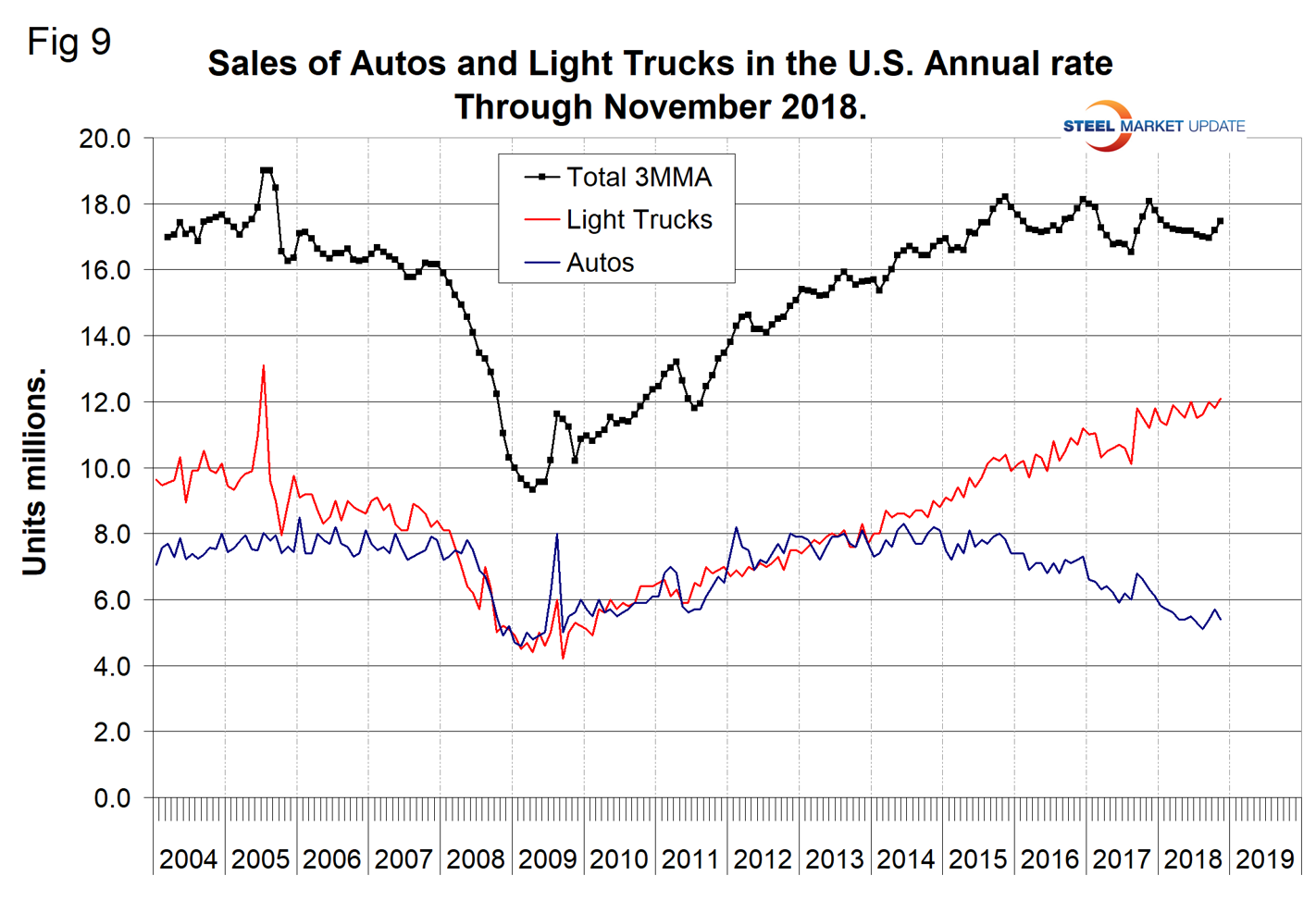 Automobile sales have trended down slightly in the last 2½ years, but ticked back up in October and November. Year over year on a rolling 12-months basis, sales were down by 0.4 percent. Sales in October totaled 17.5 million units annualized and were comprised of 69 percent light trucks and 31 percent autos. The declining sales of autos is why last week GM announced its intent to close several small car plants. The light truck category includes SUVs and crossovers. Overall, sales are still higher than the pre-recession level (Figure 9). Import market share in October was 22.3 percent and has been drifting up since March last year.