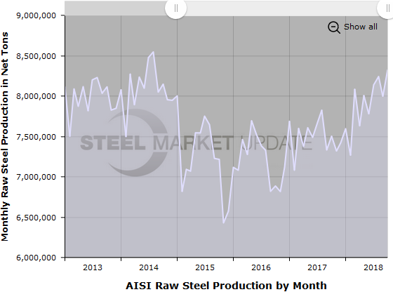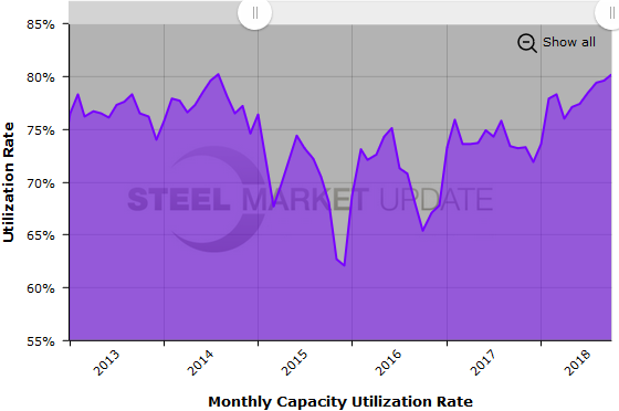 The mill capacity utilization rate for October 2018 was 80.2 percent, up from 79.6 percent in September, and up from 73.2 percent one year ago. This is also the highest production rate since August 2014, when 8,546,303 tons were produced at a capacity utilization rate of 80.2 percent.