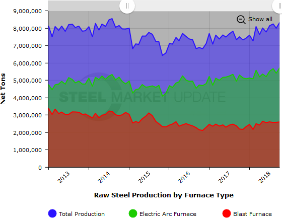 The chart below shows total monthly steel production (blue) broken down by electric arc furnace production (green) and blast furnace production (red).