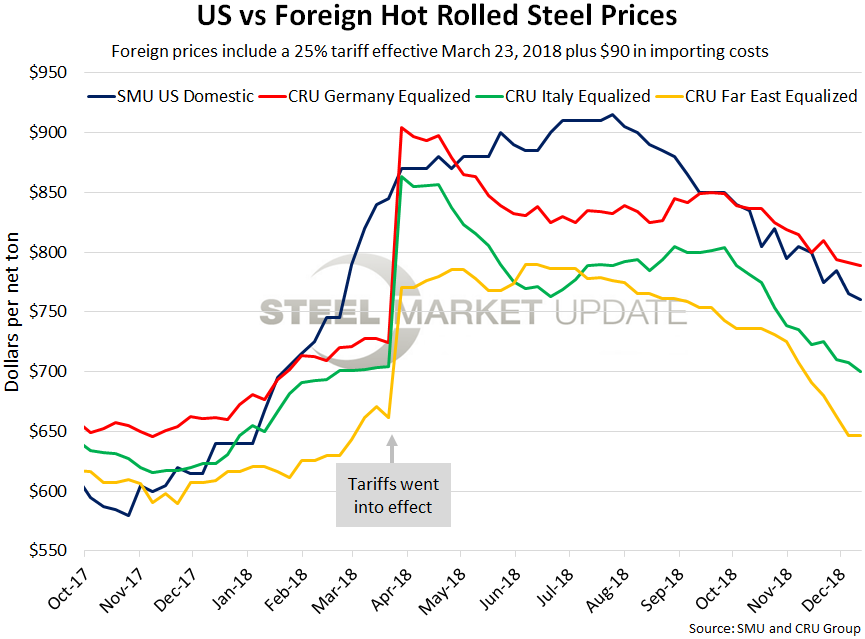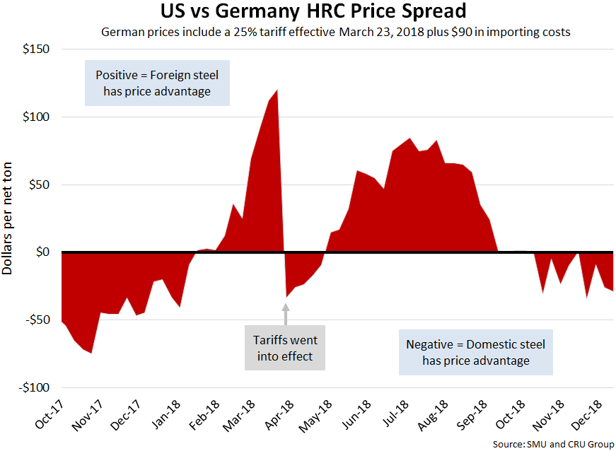 The graph below shows all four prices together and points out the effective date of the tariffs. Foreign prices are referred to as “equalized,” meaning they have been adjusted with the tariffs and importing costs for an apples-to-apples comparison against the U.S. price.