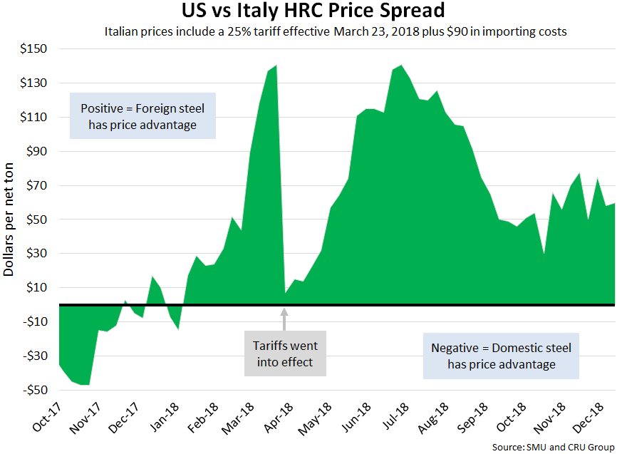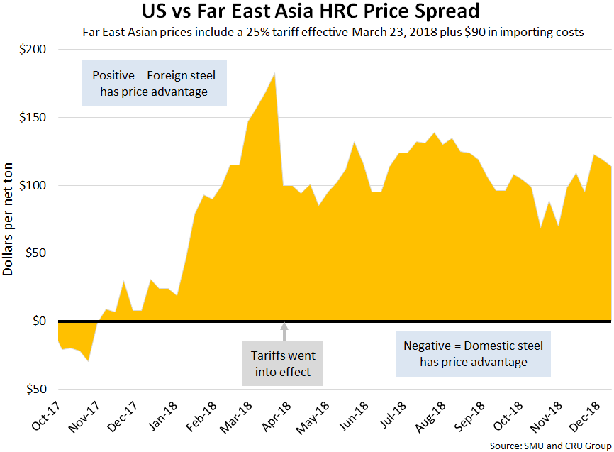 SMU now includes a 25 percent import tariff in our foreign vs. domestic price calculations, effective on foreign prices after March 23, 2018. We then add $90 per ton to the foreign prices in consideration of freight costs, handling, trader margin, etc. This provides an approximate “CIF U.S. ports price” that can then be compared against the SMU U.S. hot rolled price. The difference between the domestic and foreign hot rolled prices is then referred to as the “price spread.” As the price spread narrows, the competitiveness of imported steel into the United States is reduced. If the spread widens, then foreign steel becomes more attractive to U.S. flat rolled steel buyers. A positive spread means foreign steel has a price advantage (U.S. prices are higher than foreign prices), while a negative spread means domestic steel has a price advantage (U.S. prices are less than foreign prices). Note that we do not include any anti-dumping (AD) or countervailing duties (CVD) in this analysis.