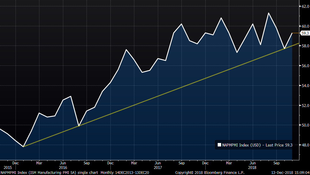The November ISM Manufacturing PMI gained 1.6 points to 59.3 and beat expectations of a slight drop. More importantly, the move higher meant the index maintained its uptrend.