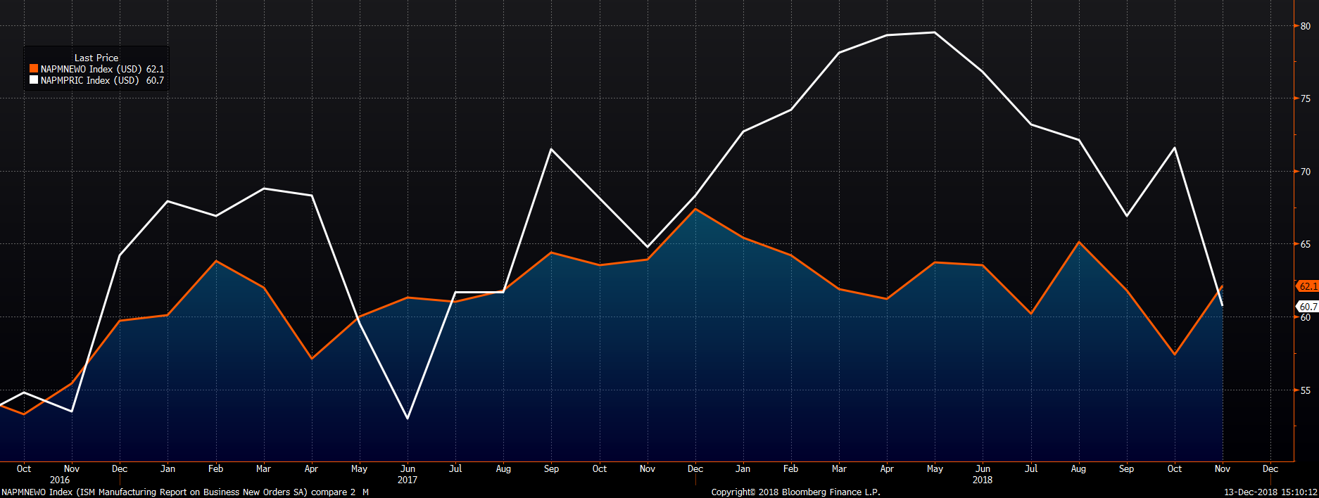ISM Manufacturing PMI New Orders (orange) & Prices Subindexes (white)