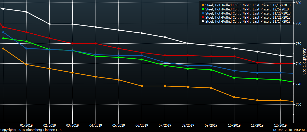 In the Nov. 15 SMU article, I noted the December HRC future was approaching the bottom end of the range it had maintained since June. Shortly after, it broke below that level and the curve has fallen $40-$50/st since.