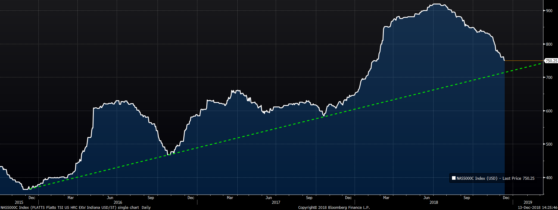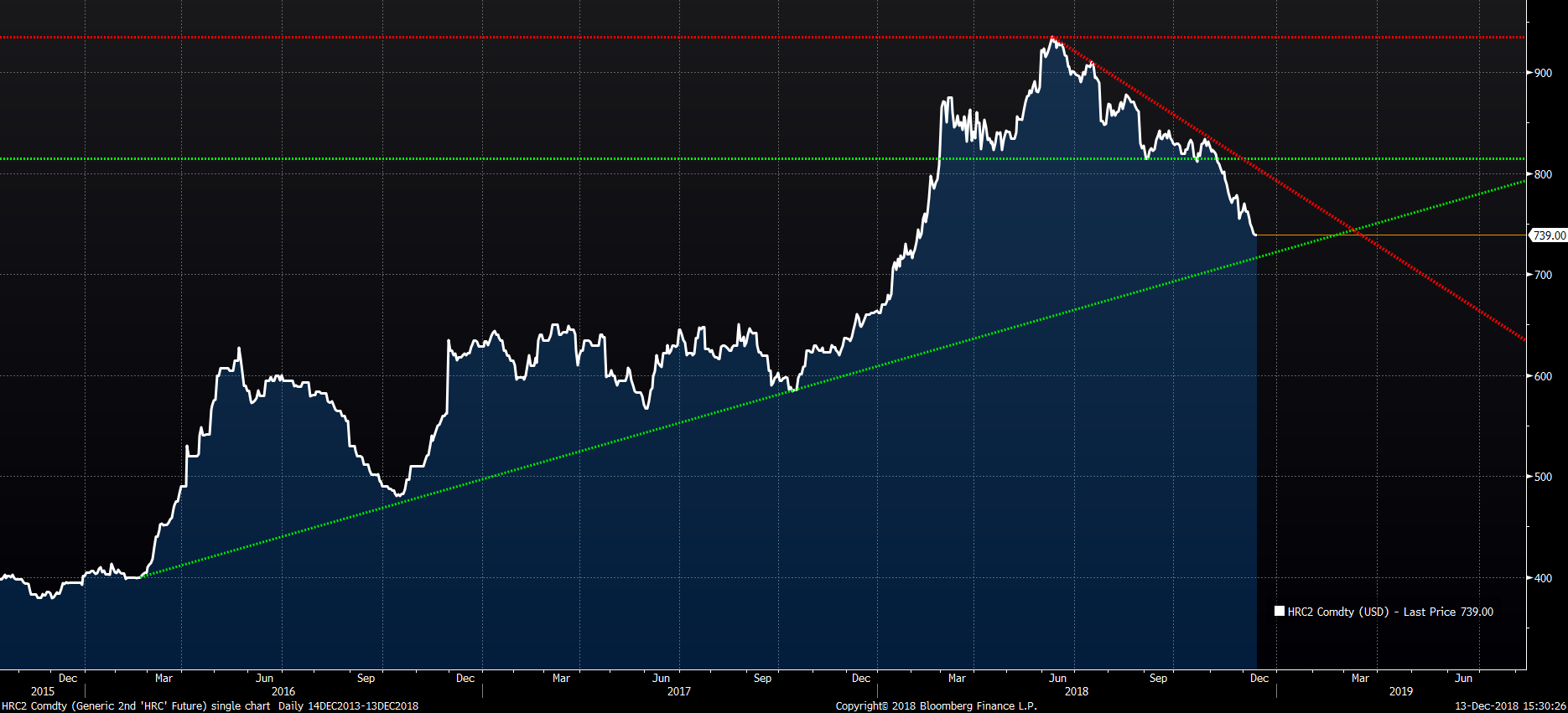 The downtrend in domestic flat rolled price is gaining momentum. This chart shows the long-term uptrend in the rolling 2nd month CME Midwest HRC future starting back in December 2015. The trendline currently sits around $715. If the price breaks below that level, then the long-term uptrend will have concluded and shifted instead into a six-month downtrend. Pay attention to this level to see if there is support or if prices break below it. To be clear, if prices break below $715 with any momentum, then the price will have to fall sharply to find a bottom that will entice buyers to step in.