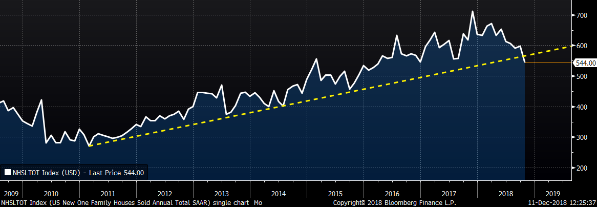 So, what is happening in the steel industry? What could cause prices to fall further? We know there is additional production coming on line and rumor has it that JSW succeeded with its EAF’s first melt this week. Imports continue to stay elevated and HRC prices in the Houston market have been under pressure. How about the demand side? U.S. residential construction has weakened. This chart shows U.S. New Home Sales breaking below its eight-year uptrend.
