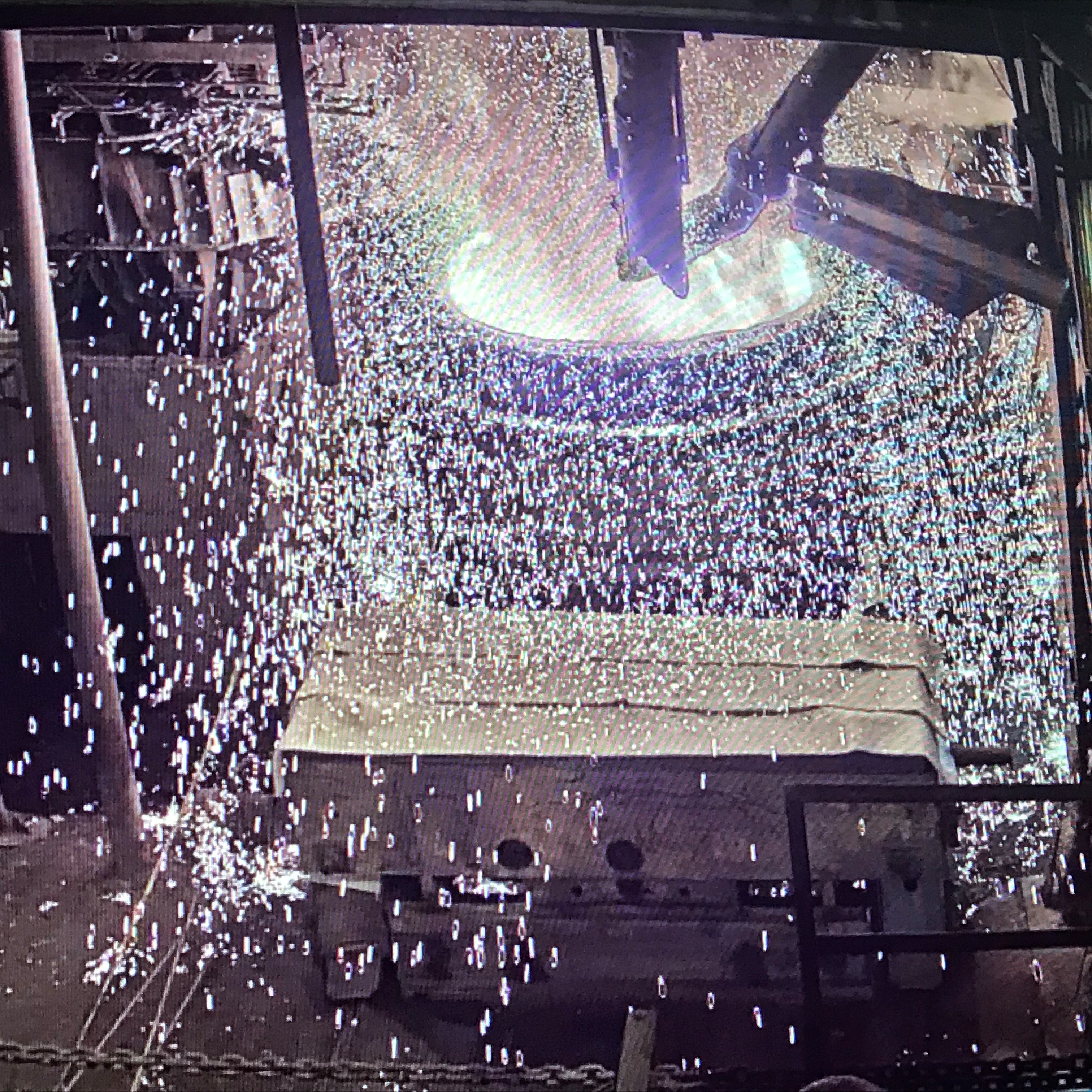 The photographs shown below were taken by JSW USA CEO John Hirtz. The first photo is the first tap of the EAF into a ladle. The second is the first, still red hot, slab produced at JSW Ohio on Friday, Dec. 14, 2018.