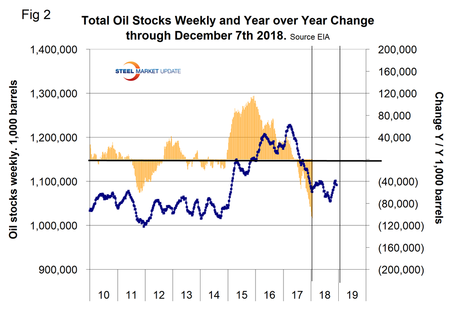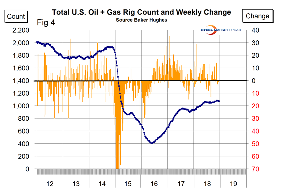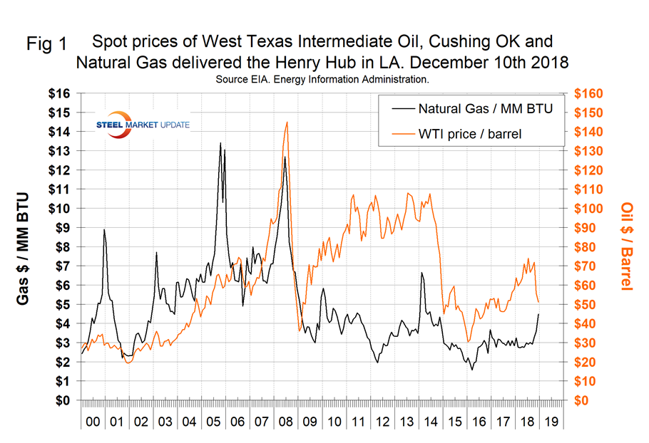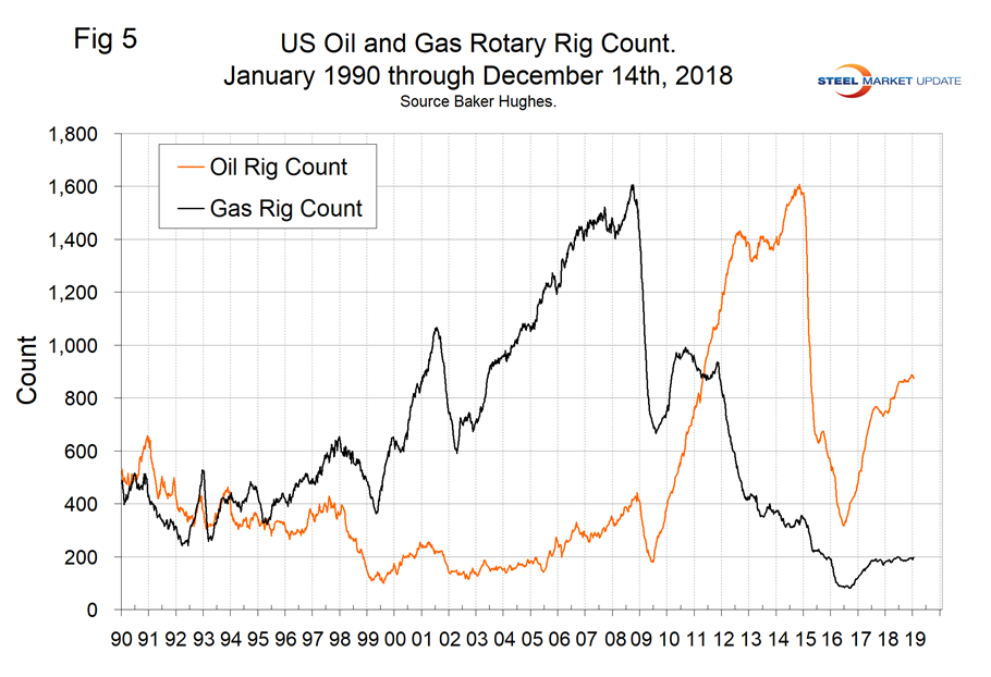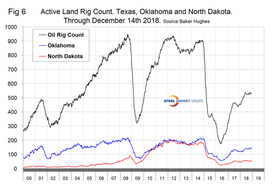 The spot price of West Texas Intermediate (WTI) FOB Cushing Okla., had a recent peak on Oct. 3 of $76.40 per barrel. By Dec. 10, the price had declined to $51.07 with a drop of $1.91 in the previous week. The total number of operating rigs exploring for oil and gas has declined by 11 in the last month. The prices of oil and natural gas drive the consumption of energy-related steel products including oil country tubular goods, pipe fittings and well head equipment, among others. Welded tubular goods (not including OCTG) consumed about 5.5 million tons of hot rolled sheet in 2017.