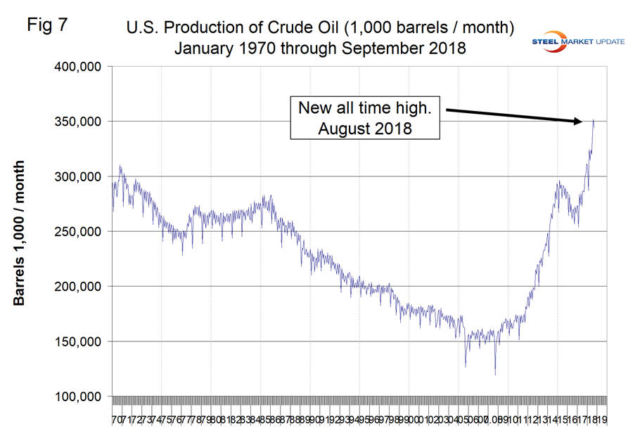 Figure 7 illustrates the monthly U.S. oilfield production of crude from January 1970 through September 2018 (latest data available) in thousands of barrels per month. The historical high was October 1970 at 310.4 million barrels. Production steadily declined to half that level in the late 2000s before the fracking revolution kicked in. December 2017 broke the record that had stood for 47 years with 310.7 million barrels produced, and August 2018 set a new record at 351.7 million barrels. The EIA forecasts that U.S. crude oil production will average 10.7 million barrels per day in 2018, up from 9.4 million in 2017, and will average 11.7 million barrels per day in 2019. EIA estimates that U.S. crude oil production averaged 11.5 million barrels per day in November, up 150,000 from October levels because of platforms resuming normal operations after hurricane-related outages in October. During the week ending Nov. 30, 2018, the United States exported more crude oil and petroleum products than it imported for the first time since the series began in 1991. From Nov. 24-30, the United States exported an estimated record 3.2 million barrels per day of crude oil, as well as an estimated 5.8 million barrels per day of petroleum products such as distillate fuel oil, motor gasoline and propane.