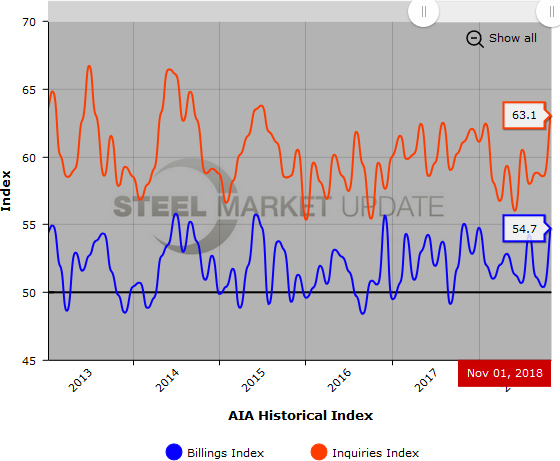 Below is a graph showing the history of the AIA Billings Index and Inquiries Index. You will need to view the graph on our website to use its interactive features; you can do so by clicking here. If you need assistance logging into or navigating the website, please contact our office at 800-432-3475 or info@SteelMarketUpdate.com.
