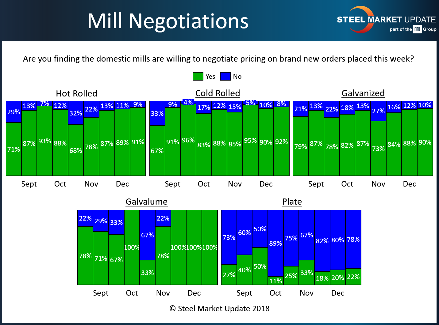 Twice each month Steel Market Update canvasses the flat rolled and plate steel markets to gauge whether the steel mills are willing to work with their steel buying customers and negotiate steel pricing for orders placed this week. At least nine out of 10 respondents to SMU’s latest market trends questionnaire report that the mills are open to price discussions on spot orders of hot rolled, cold rolled, galvanized and Galvalume steel products.