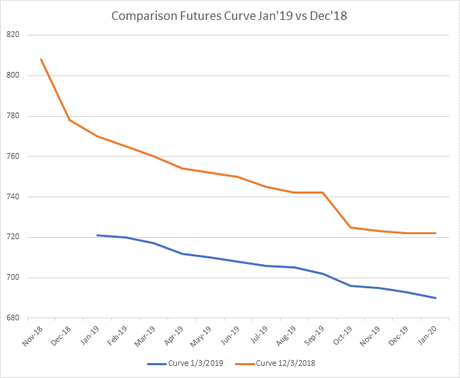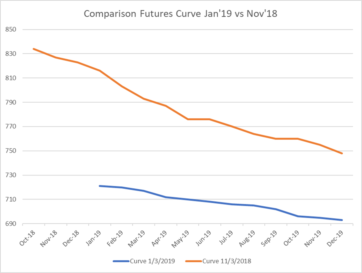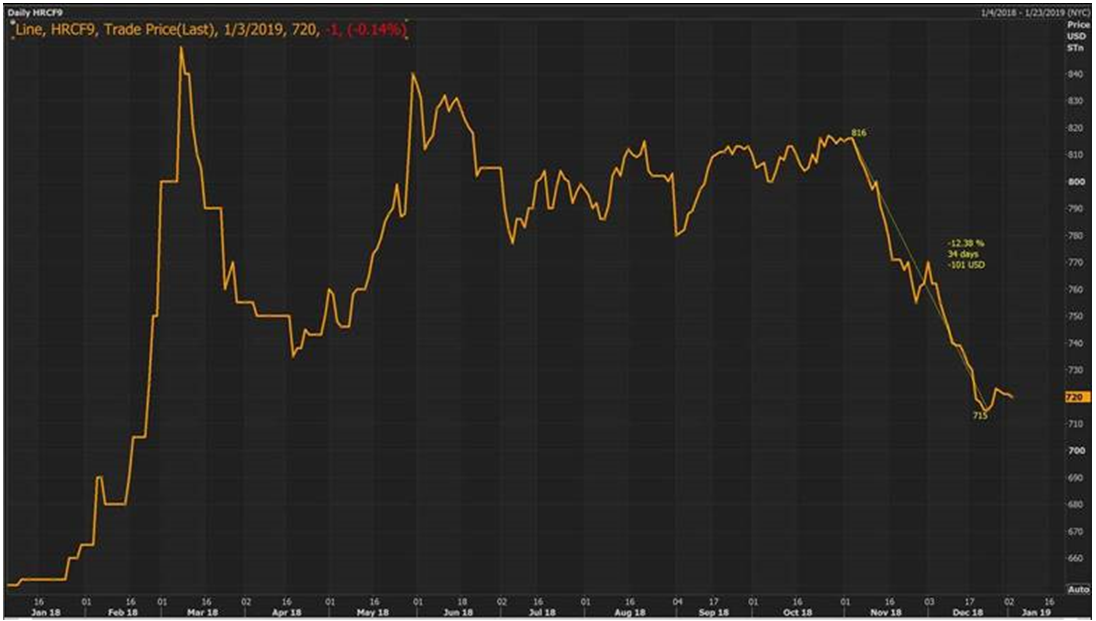 During discussions with a client today, I was asked if the curve may go into a contango and what that would imply. A contango is when the prices in the future months are higher than spot prices. Aggressive drops in the index can at times result in changes to the shape of a curve. While the U.S. HRC curve hasn’t moved from backwardation to a contango in the period from Nov ’18 (Orange line) to the start of Jan ’19 (Blue line), it has indeed become flatter. This flatter curve is indicative of both a lack of conviction of another major correction from the sellers, as well as a belief that we might be nearing the bottom.