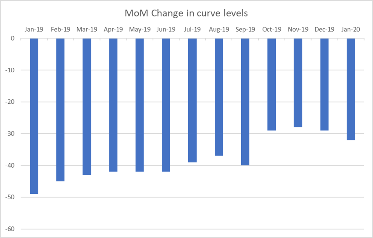 The front months of the futures curve have come down $40 to $50 in the last one month (Blue line – Jan. 3; Orange line – Dec. 3).