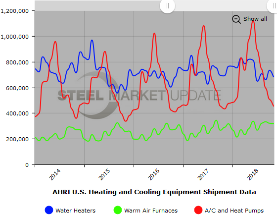 Below is a graph showing the history of total water heater, warm air furnace and air conditioner shipments. You will need to view the graph on our website to use it’s interactive features; you can do so by clicking here. If you need assistance with either logging in or navigating the website, contact info@SteelMarketUpdate.com.