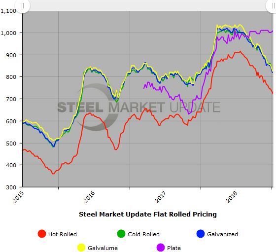 SMU Note: Below is a graphic showing our hot rolled, cold rolled, galvanized, Galvalume and plate price history. This data is available here on our website with our interactive pricing tool. Note that plate prices are not yet available on our website, but we are in the process of adding that dataset. If you need help navigating the website or need to know your login information, contact us at info@SteelMarketUpdate.com or 800-432-3475.