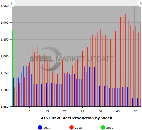 U.S. mills began the new year with little sign of a slowdown. Raw steel production by U.S. steelmakers in the week ending Jan. 5 totaled 1,876,000 net tons for a capability utilization of 80.0 percent. Steel production was down a slight 1.2 percent from the prior week, but up 10.1 percent from the same week last year when the utilization rate was 73.1 percent, reported the American Iron and Steel Institute.