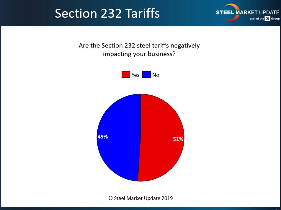 Steel Market Update asked: Are the Section 232 tariffs negatively impacting your business? The market is evenly split on the subject. About half of those responding to SMU’s questionnaire this week—primarily service center and OEM executives—say they have been hurt by the tariffs, while the other half say the tariffs have had no direct effect.