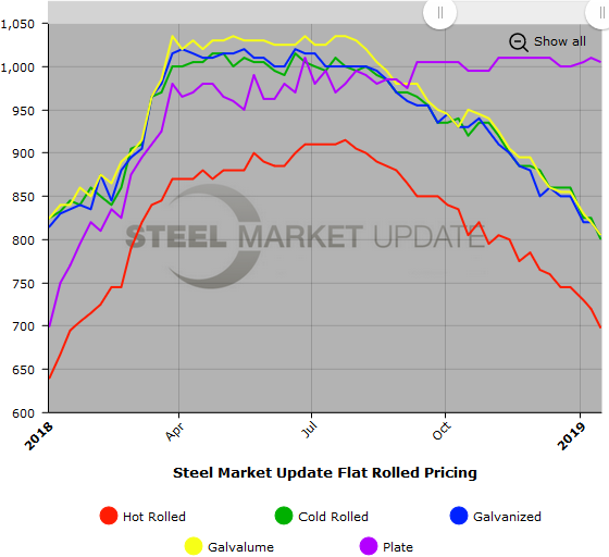 SMU Note: Below is a graphic showing our hot rolled, cold rolled, galvanized, Galvalume and plate price history. This data is available here on our website with our interactive pricing tool. Note that plate prices are not yet available on our website, but we are in the process of adding that dataset. If you need help navigating the website or need to know your login information, contact us at info@SteelMarketUpdate.com or 800-432-3475.