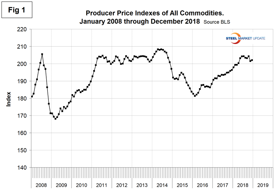 Figure 1 shows the composite PPI of all commodities since January 2008. The index rose steadily for 2½ years through mid-2018 before declining in H2 2018. Overall, the composite was up by 2.9 percent in the 12 months of 2018.