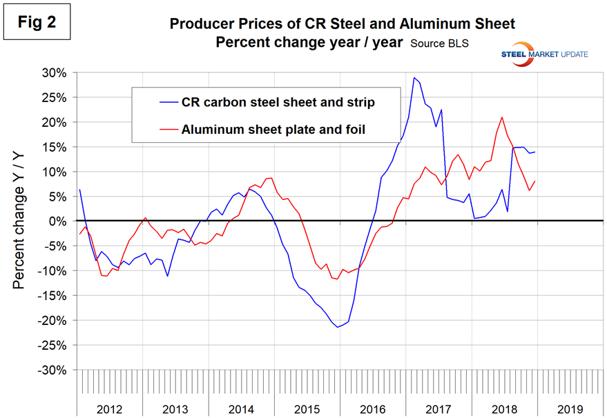 Figure 2 shows the year-over-year comparison of the price change of cold rolled steel sheet and flat rolled aluminum. In the 12 months August 2017 through July 2018, aluminum prices escalated faster than steel. In the second half of 2018 the situation reversed.