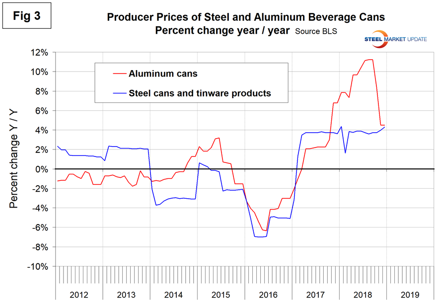 Figure 3 shows the same comparison for steel tinware products and aluminum cans. Aluminum is a much more energy intensive product than steel and this is reflected in the PPI of both aluminum sheet and aluminum cans. For this reason, the competitive position of aluminum has improved recently and this is likely to continue. There is a lag between price changes of sheet and the price change of cans.