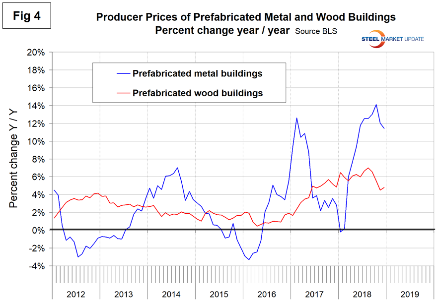 Figure 4 compares prefabricated metal with prefabricated wood buildings. The price of steel has escalated faster than wood buildings for most of the last 2½ years.