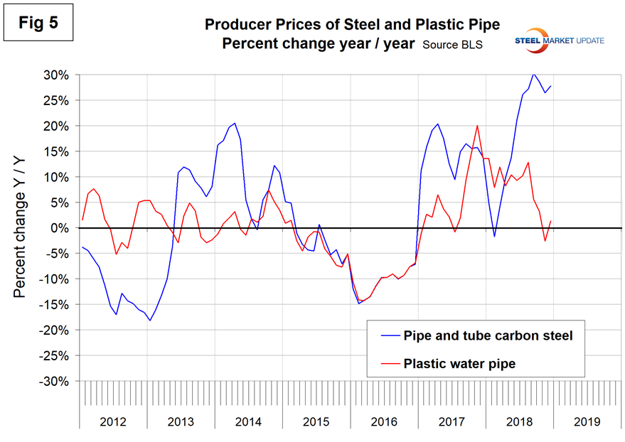 Figure 5 compares the price changes of steel and plastic pipe, which moved in opposite directions to the detriment of steel in 2018. Plastic is also a highly energy-intensive product; therefore, this situation is not expected to reverse in the near future.