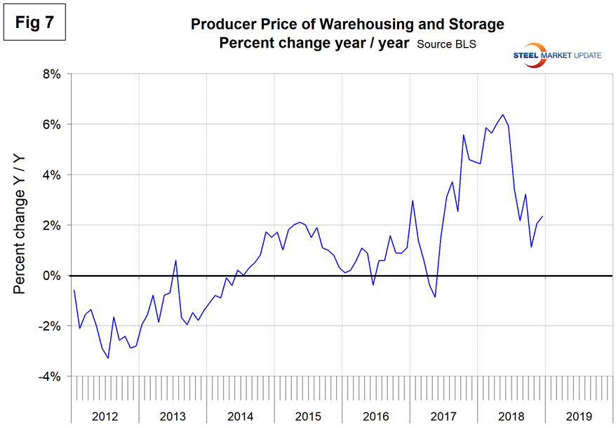 Figure 6 compares the changes in the price of truck and rail transportation. The escalation of trucking prices has exceeded those of rail almost every month since January 2014. The differential widened through July 2018, narrowed, then widened again in the fourth quarter. As the price of diesel fuel follows that of crude oil (which so far hasn’t happened), the escalation in trucking costs should decline. In December, year-over-year trucking costs were up by 8.8 percent as rail was up by 5.8 percent.