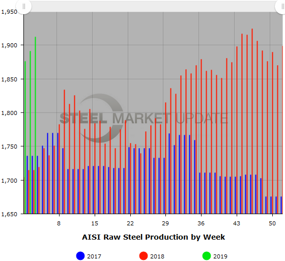Raw steel production by U.S. steelmakers in the week ending Jan. 19 totaled 1,912,000 net tons for a capability utilization of 80.7 percent. Steel production was up 1.1 percent from the prior week and up 11.5 percent from the same week last year when the utilization rate was 73.6 percent, reported the American Iron and Steel Institute.