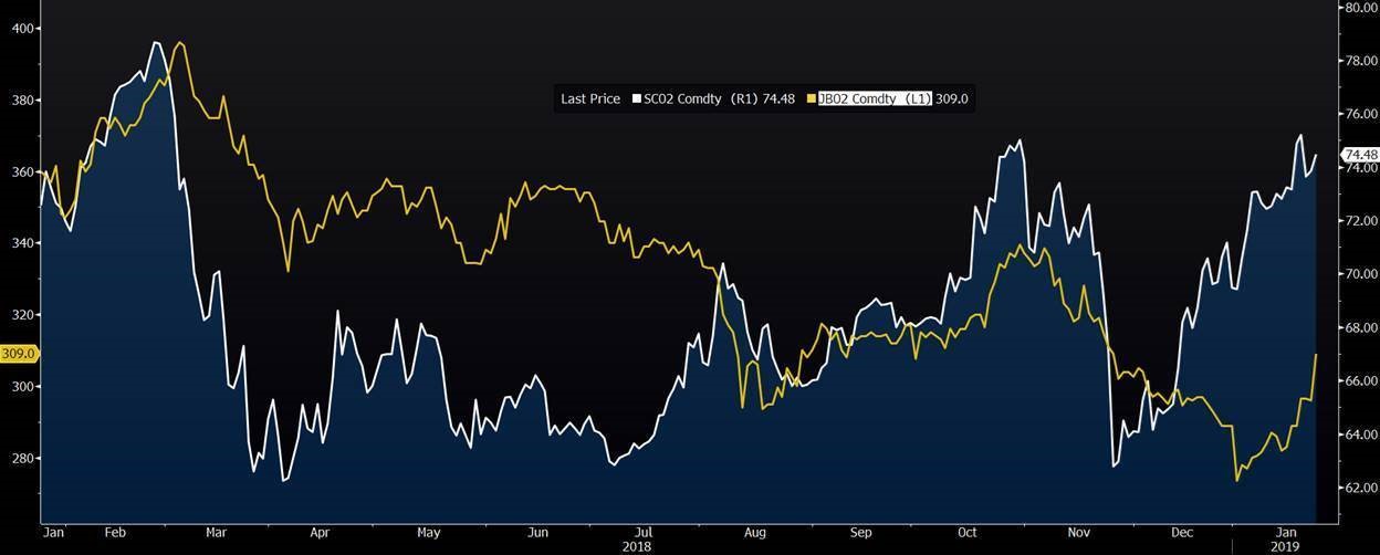 Lack of selling pressure on the back end of the curve is a result of a few factors. Fewer cheap import opportunities that allow hedgers to lock in margins is certainly one of the reasons we have discussed. There is merit to that argument. International steel mills have been experiencing margin compression. Prices of Iron Ore (white) have stayed supported limiting the ability of mills in China and SE Asia to be aggressive on prices. This support on Iron Ore has translated into expectations for scrap prices (2nd month LME Scrap contract -Yellow) turning positive.