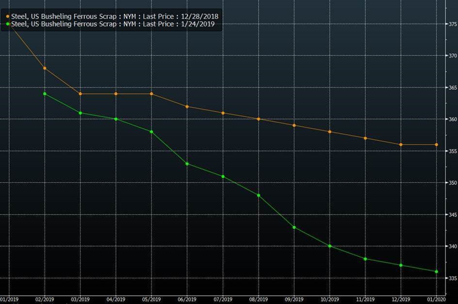 The view on scrap futures in the U.S., however, doesn’t reflect the same view of the future. Month-over-month change in the scrap curve below (Green-today; Orange-last month) shows the future expectations of the market on scrap.