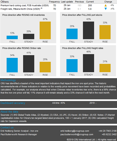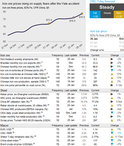 The tragic dam accident in Brazil together with a cyclone off the Australian coast lifted iron ore prices in the past week. On Tuesday, Jan. 29, CRU has assessed the 62% Fe, CFR China fines price at $78.60 /t, up $2.60 /t w/w.