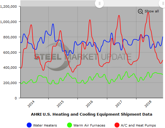 Below is a graph showing the history of total water heater, warm air furnace and air conditioner shipments. You will need to view the graph on our website to use it’s interactive features; you can do so by clicking here. If you need assistance with either logging in or navigating the website, contact info@SteelMarketUpdate.com.