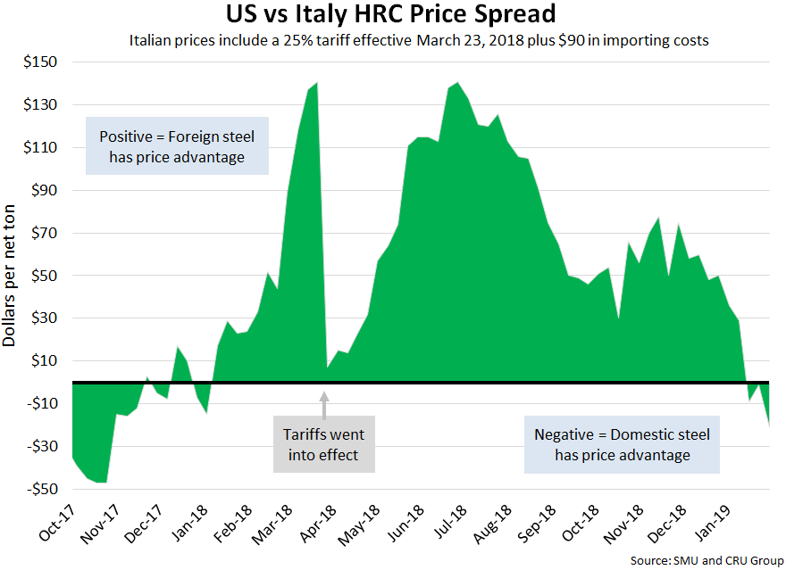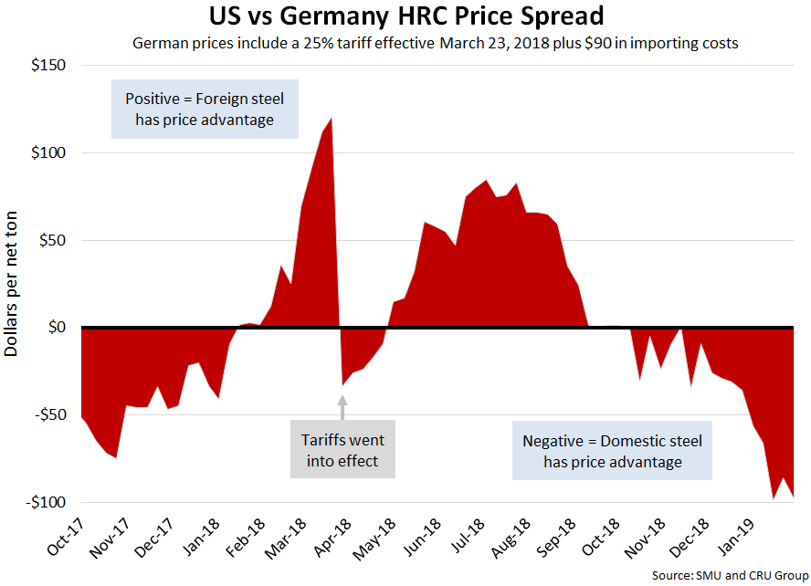 SMU now includes a 25 percent import tariff in our foreign vs. domestic price calculations, effective on foreign prices after March 23, 2018. We then add $90 per ton to the foreign prices in consideration of freight costs, handling, trader margin, etc. This provides an approximate “CIF U.S. ports price” that can then be compared against the SMU U.S. hot rolled price. The difference between the domestic and foreign hot rolled prices is then referred to as the “price spread.” As the price spread narrows, the competitiveness of imported steel into the United States is reduced. If the spread widens, then foreign steel becomes more attractive to U.S. flat rolled steel buyers. A positive spread means foreign steel has a price advantage (U.S. prices are higher than foreign prices), while a negative spread means domestic steel has a price advantage (U.S. prices are less than foreign prices). Note that we do not include any anti-dumping (AD) or countervailing duties (CVD) in this analysis.