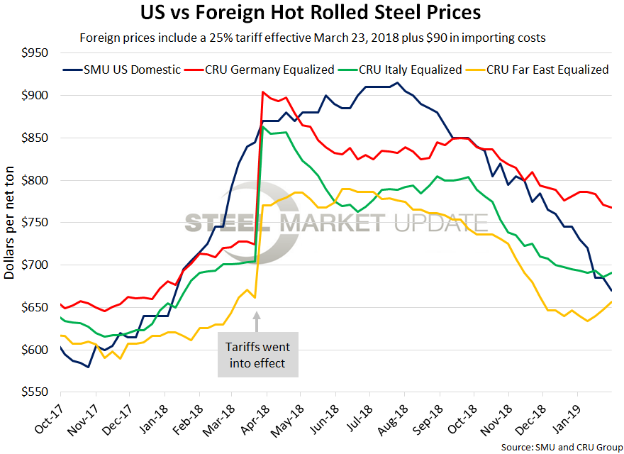 CRU published Italian HRC prices at $481 per net ton, up $4 from the previous week, but down $2 from two weeks prior. After adding tariffs and import costs, the delivered price of Italian HRC is approximately $691 per ton. Therefore, the spread is now -$21 per ton, down from -$1 last week, and down from -$9 two weeks ago. That means domestic HRC is theoretically now $21 per ton cheaper than Italian steel imported into the U.S. January 2019 is the first month where domestic HRC has had an advantageous price over Italian steel in over one year. The four-week average price spread is now -$1 per ton, down from +$14 from last week.