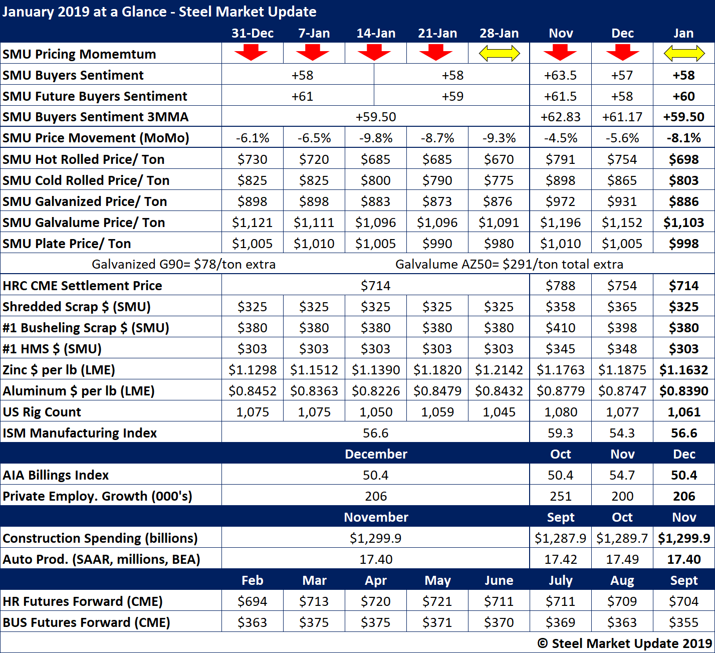 In January, spot market steel prices continued the slide that began last summer. The price for hot rolled dipped below $700 per ton and cold rolled approached $800 per ton. Even plate, which has been in short supply, has seen its price begin to weaken, and is now selling below $1,000 per ton. In the aggregate, steel prices dipped by more than 8 percent in January from the prior month.
