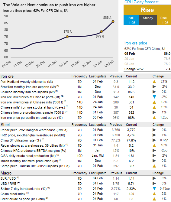 Iron ore prices continued to climb during the week as uncertainty regarding Vale’s supply persists. With weak buying in China due to the holidays, we have seen the market react by pushing the 62% Fe fines price up to $86.00 /t, $7.40 higher w/w.