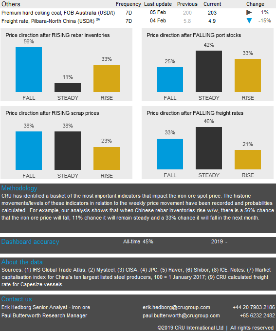 The demand side in China is expected to remain quiet in the next week. The supply uncertainty continues and will dictate the iron ore price direction in the coming weeks. Our indicators below suggest there is room for the price to correct somewhat, but any news on Vale’s production can generate large price swings in either direction. We see a risk for further output suspensions and therefore expect prices to be higher one week from now.