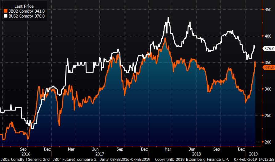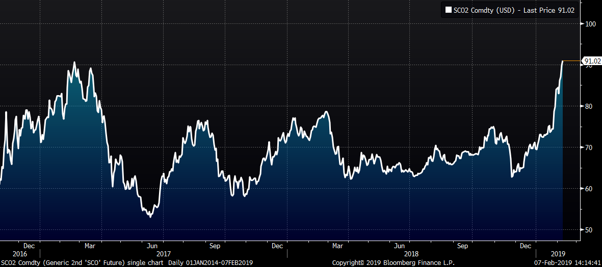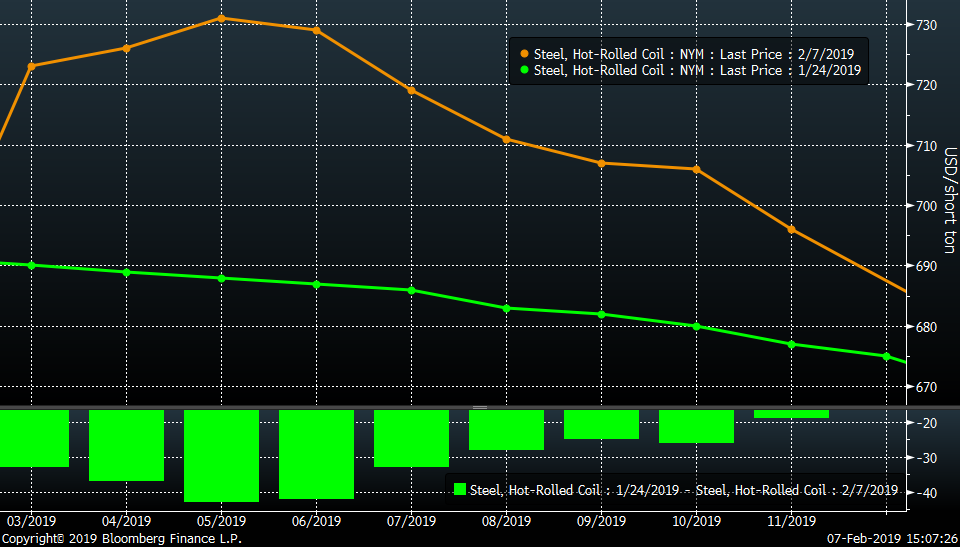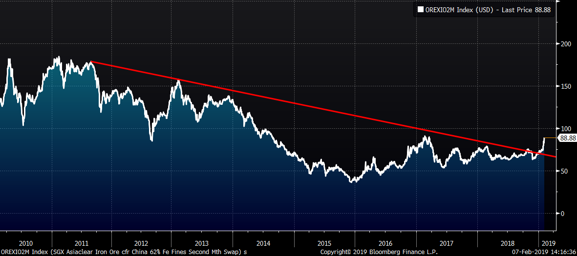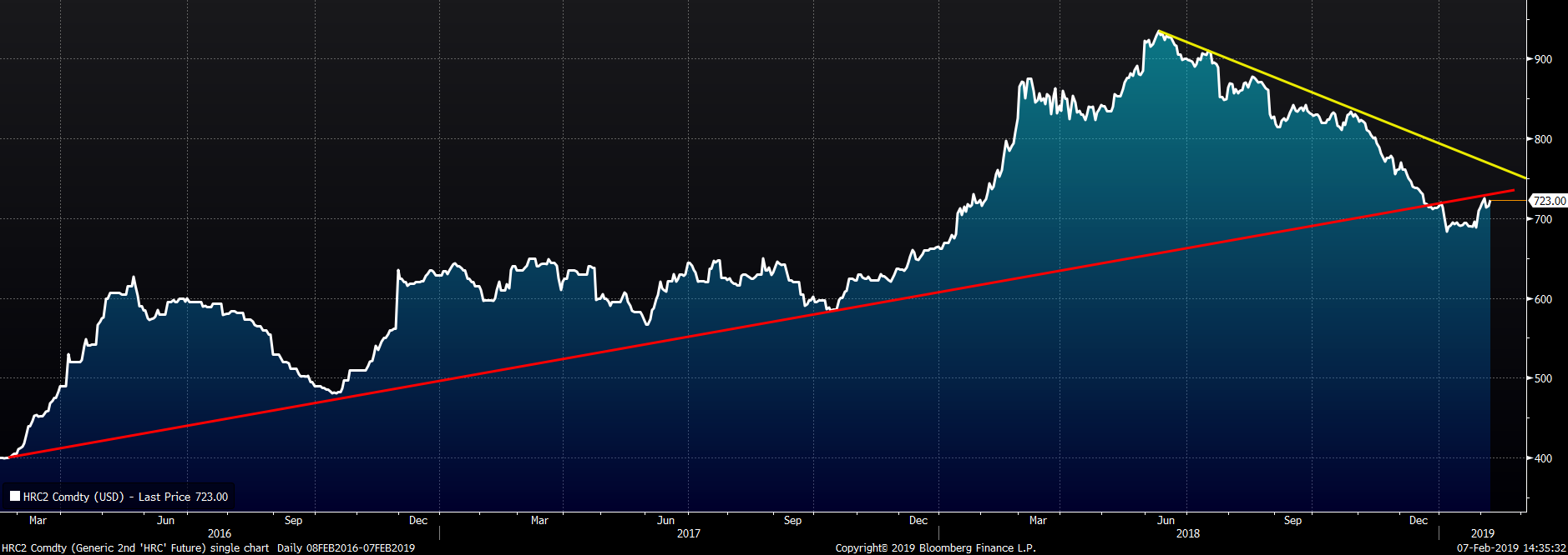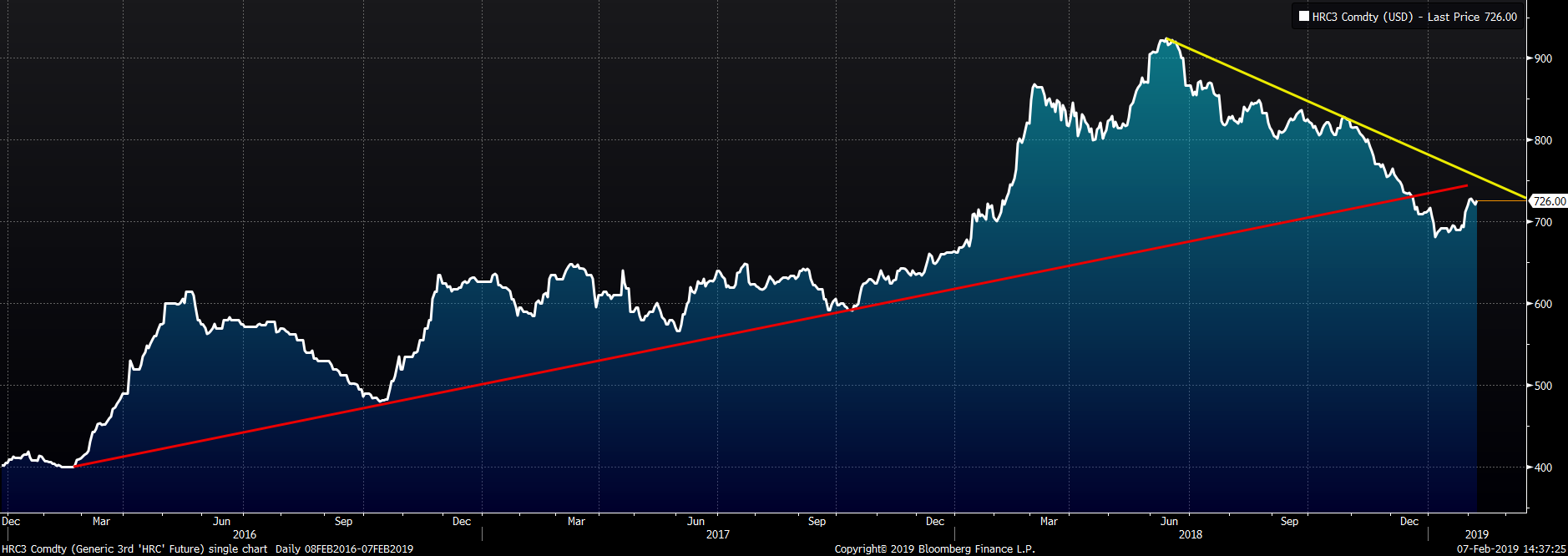 Iron ore broke above a seven-year trendline in Q4 of 2018. While the price of iron ore has remained below $100/t since 2014, it reached its all-time high at $180/t in 2011. Since 2004, Chinese economic policy has caused a number of epic commodity rallies, especially in ferrous-related product, that have reverberated across the globe, leading U.S. flat rolled prices to astronomical levels. However, the likelihood of another breakneck rally in ore with so much excess production capacity is probably low. Maybe, this time it’s different? Considering the Chinese are on their Lunar New Year holiday, much of this rally may be due to illiquidity. Then again, maybe it’s not, so keep a close eye on ore going forward, especially the futures market Sunday night as China returns from holiday.