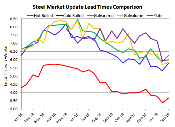 Hot rolled lead times now average 3.66 weeks, up from 3.38 weeks in mid-January. Current lead times for hot rolled are still well below the 5.07 weeks at this time last year and about two weeks shorter than the past year’s peak of 5.73 weeks.