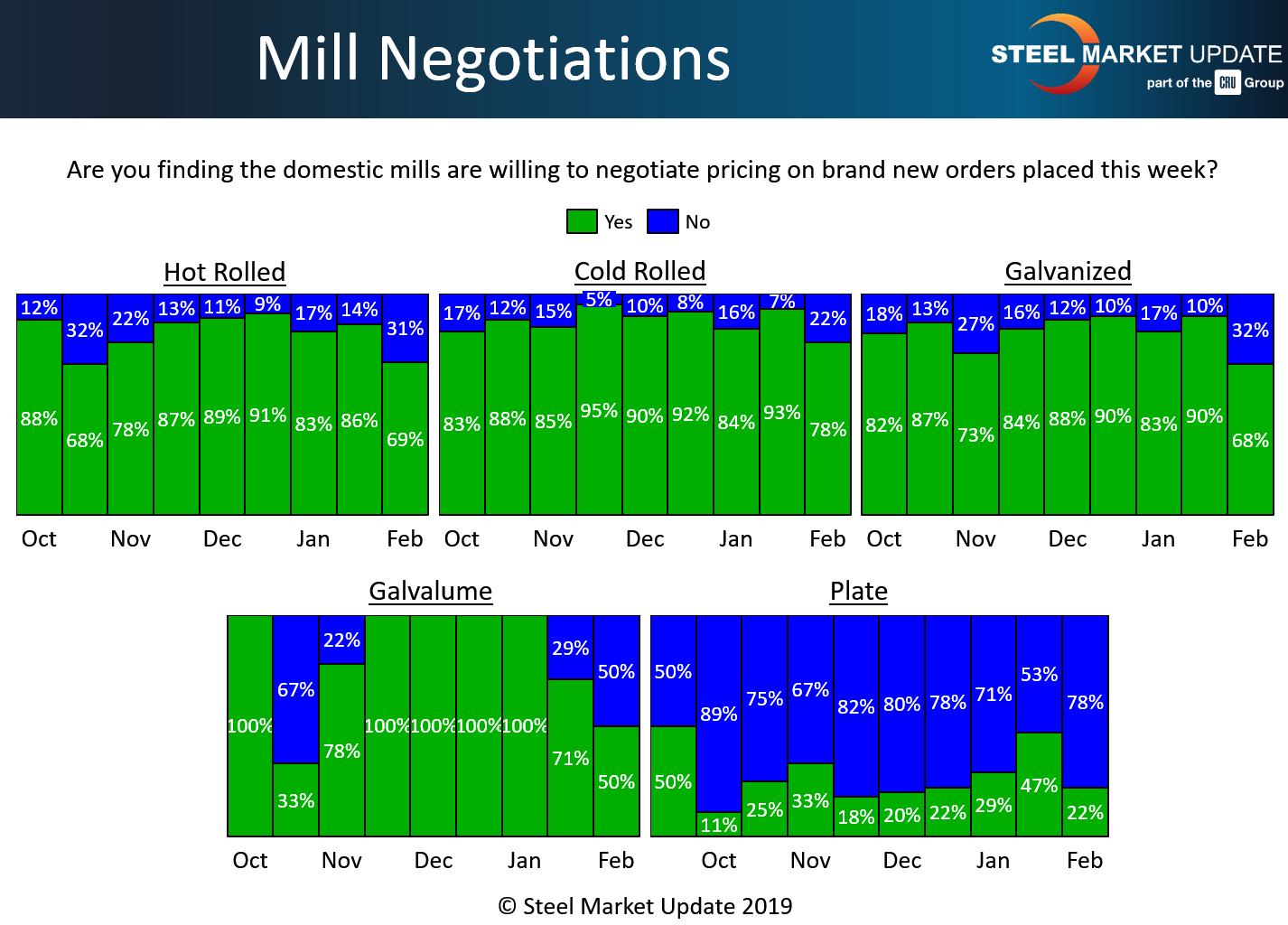 Note: SMU surveys active steel buyers twice each month to gauge the willingness of their steel suppliers to negotiate pricing. The results reflect current steel demand and changing spot pricing trends. SMU provides our members with a number of ways to interact with current and historical data. To see an interactive history of our Steel Mill Negotiations data, visit our website here.