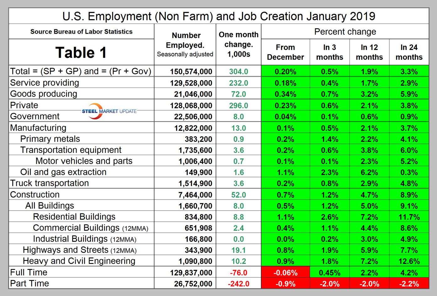 In January, 296,000 jobs were created in the private sector and 8,000 in government. Table 1 breaks total employment down into service and goods-producing industries and then into private and government employees. Most of the goods-producing employees work in manufacturing and construction and the components of these two sectors of most relevance to steel people are broken out in Table 1.